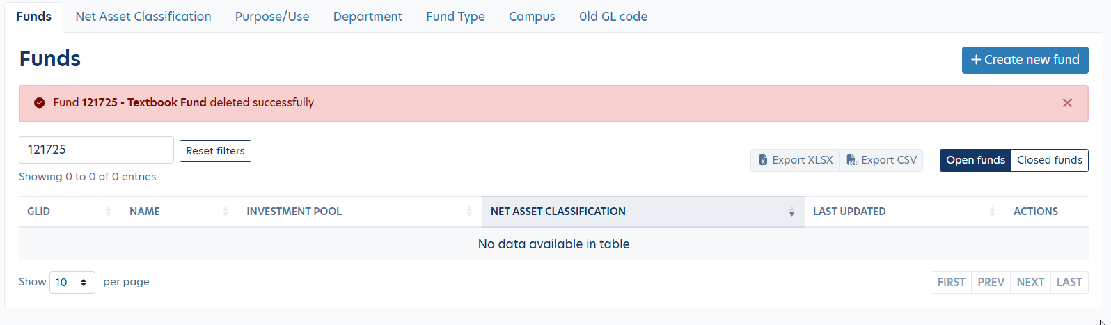 - A red banner will appear confirming that the fund has been deleted.