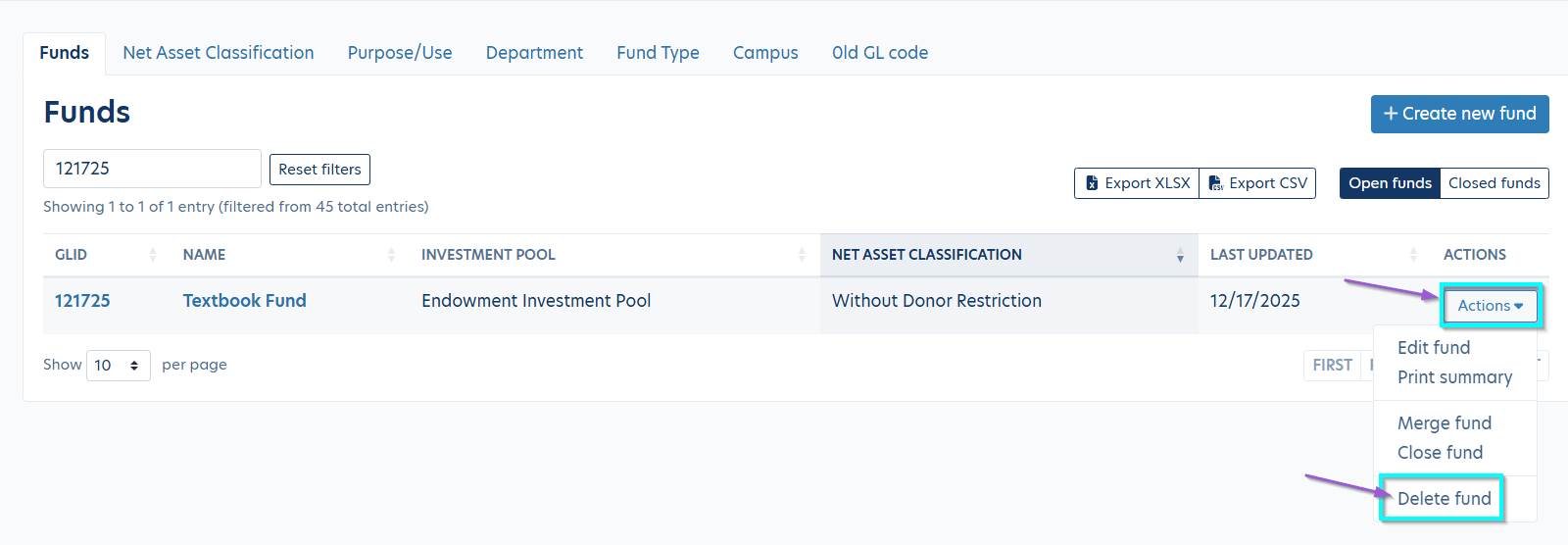 - Click the 'Actions' button next to the fund and select 'Delete fund'.