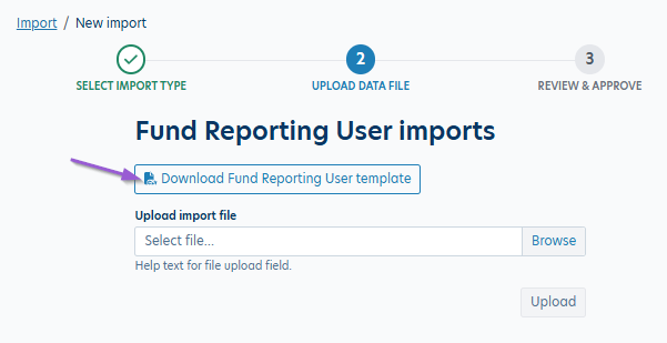 - Select the "Fund Reporting User Import" import type from the drop down and click the Continue button.
