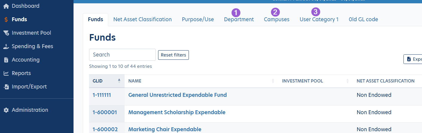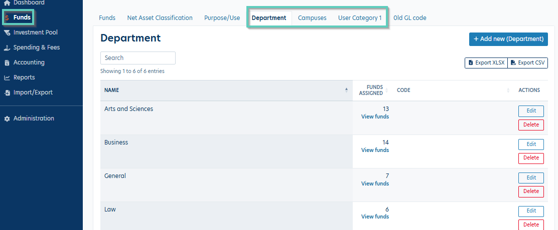 You can view available items by navigating to Funds, then clicking on the tab for the field in question. All items will be listed in the table and you can click the "Add new" button to create new items. You can also use the Edit and Delete buttons to clean up the list as needed.You'll need a separate row for each item/GLID to be assigned.