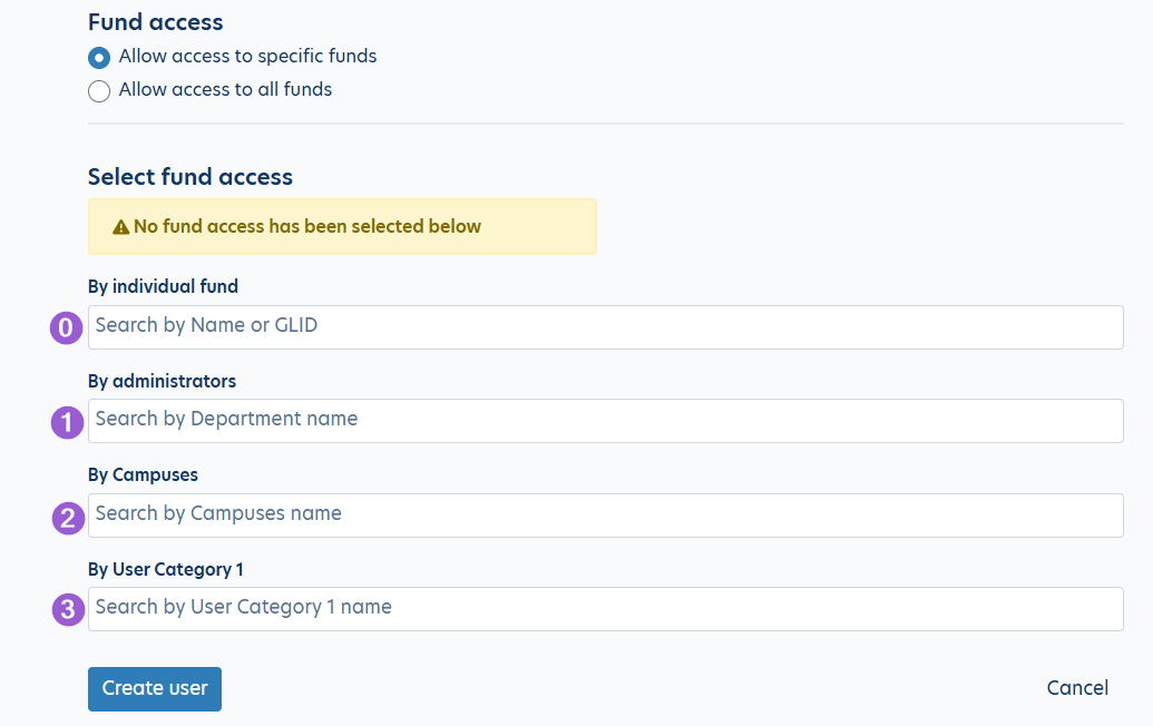 If you entered 0 for an individual fund, you'll enter the GLID in this cell. You'll need to create additional rows for each individual fund you're assigning to a user.