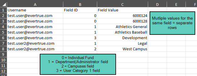 - Column B "Field ID" should be populated with single digit between 0-3. These numbers will align with the fields shown under the user profile when assigning funds to fund reporting role users manually.
