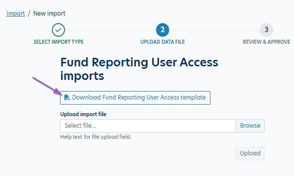 - Select the "Fund Reporting User Access Import" import type from the drop down and click the Continue button.