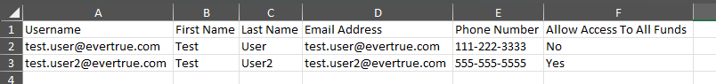 - Column F "Allow Access To All Funds" - enter "Yes" or "No" if the user should have access to all funds in your database.
