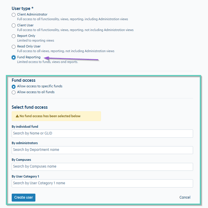 You'll follow the same steps for adding a new user but will select Fund Reporting for the User type. A Fund access section will then populate allowing you to setup access for the new user.